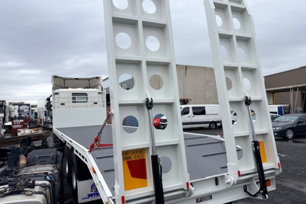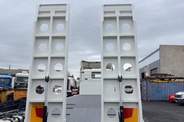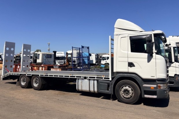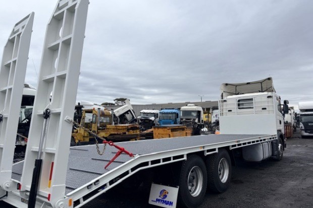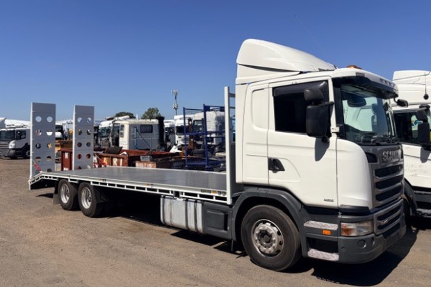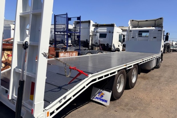 2013 G440 6X4 DAYCAB CAB CHASSIS FITTED WITH BRAND NEW 9.2 METER LONG STEEL BEAVERTAIL TRAY WITH HYDRAULIC RAMPS. ONLY 593000 KLMS AUTO BOGGIE DRIVE . VERY TIDY TRUCK.